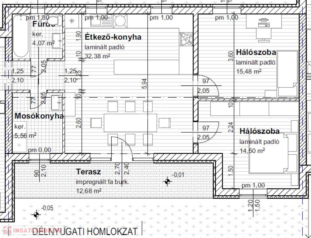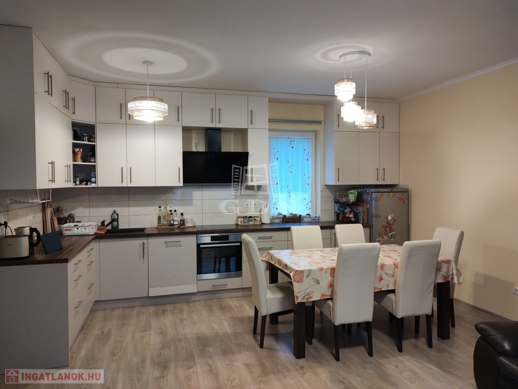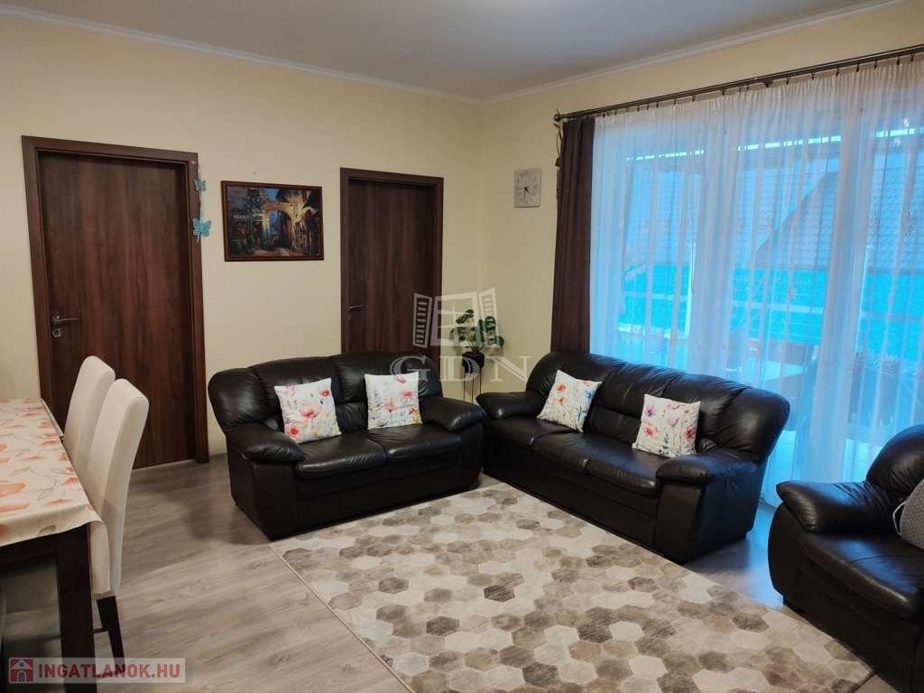 Az épület kiváló elosztású, tágas, napfényes, teraszkapcsolatos, amerikai konyhás nappali, két hálószoba, előszoba, toalett került kialakításra.