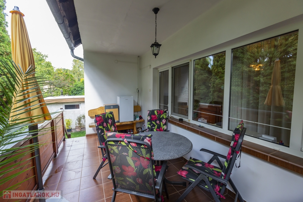 A nappaliból kellemes, nagyméretű fedett teraszra léphetünk, ahol a kerti fák közelségét élvezhetjük.