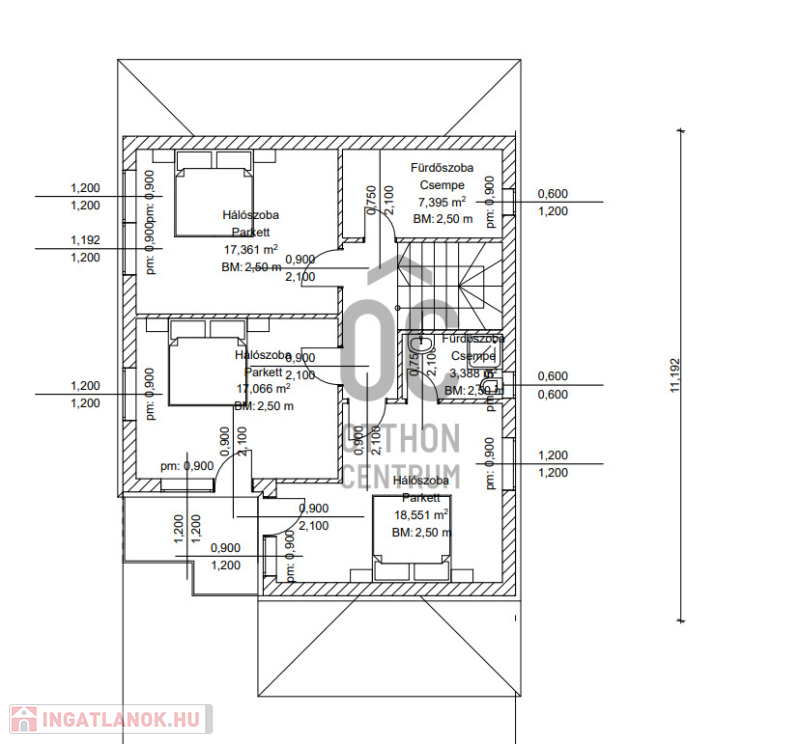 Emelet: Három tágas hálószoba (melyből kettő teraszkapcsolatos), az egyik szobához saját fürdőszoba is tartozik.