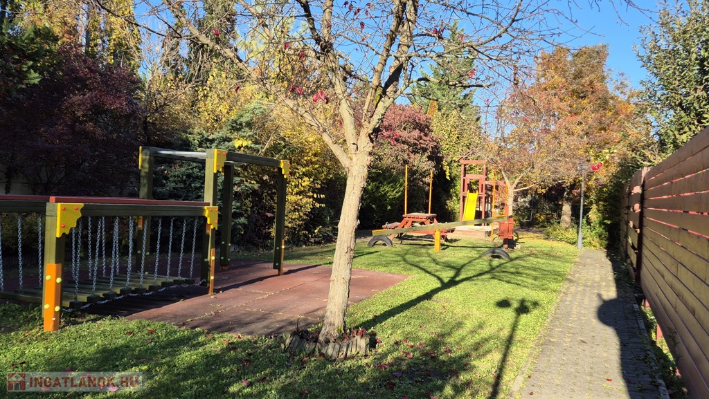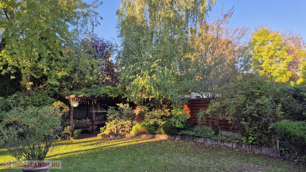 -Hangulatos kertkapcsolat: tervezett, gondozott kert grillezővel, kerti pergolával, 7 m²-es faházzal.