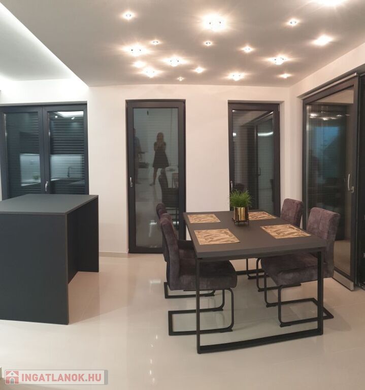 Korszerű Fenstherm nyílászárók (3 rétegű, argongázzal töltött üvegezés, 8 légkamrás md88passiv tok ). Minden nyílászárón Antracit színű, alumínium lamellás, elektromos redőny van.