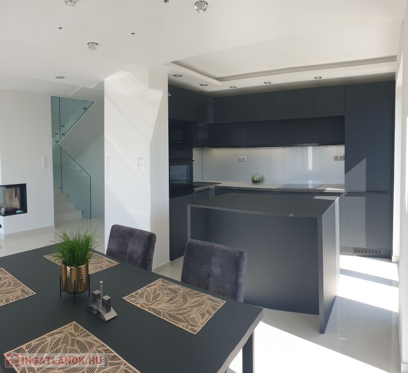 A konyha a legdrágább szuper matt szürke színű Akryl felületet kapta, a beépített konyha gépek pedig fekete színűek.