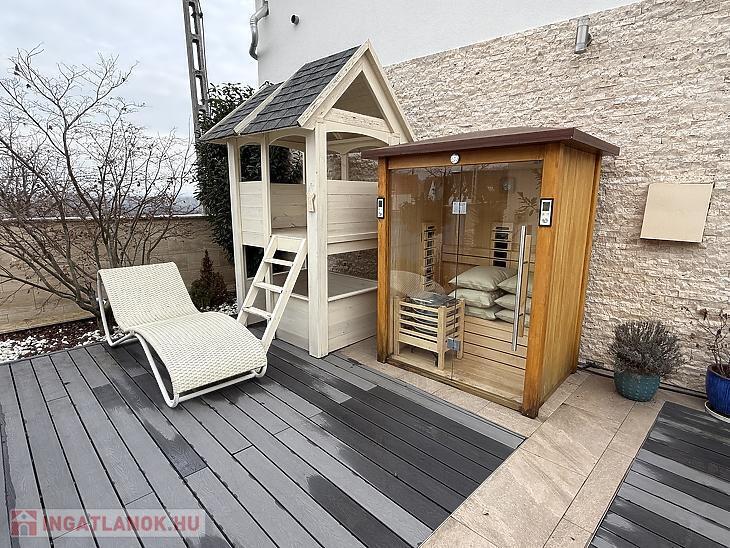 -A kertben kialakított szauna és a beépített medence igazi különlegességet jelentenek, amelyek tökéletes kikapcsolódást biztosítanak az év minden szakaszában.