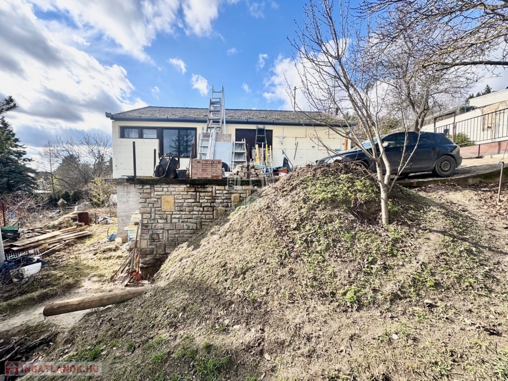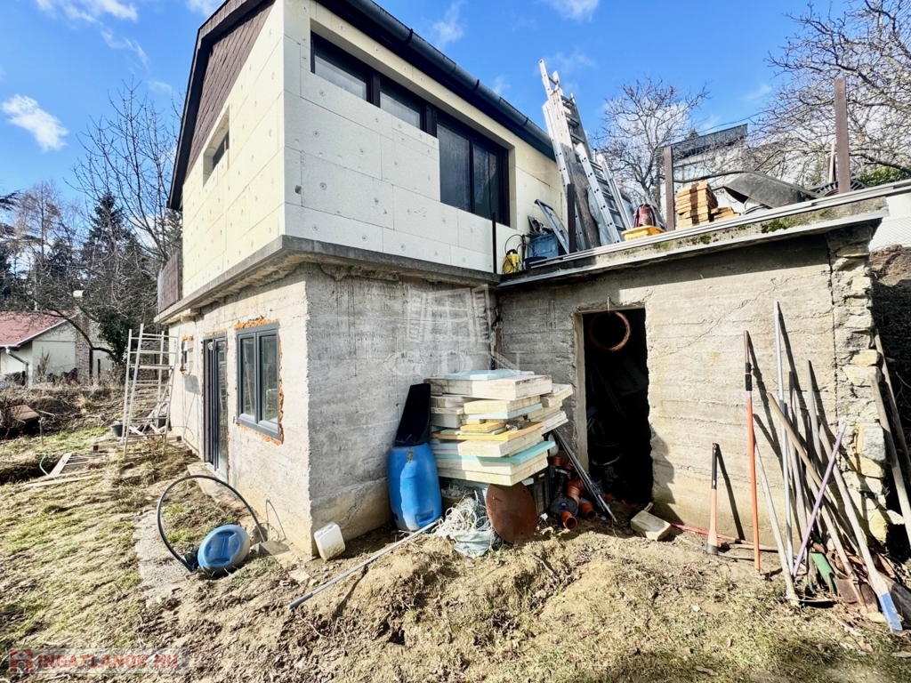Szentendre kedvelt hegyvidéki környezetében, Tyúkosdűlő csendes aszfaltozott, mellékutcájában, ÜH/1 övezeti besorolású, 883 nm-es, telken, 1950-ben 30 cm-es téglából épült, 50 nm-es lakóterületű, 2 szobás, lapostetős, monolit betonfödémes, 3 rétegű nyílászárókkal szerelt lakóház eladó. A már meglévő épületre egy 50 nm-es, lakóterületű, 3 szobás könnyűszerkezetes, 10 cm-es külső hőszigeteléssel ellátott, összkomfortos faház került elhelyezésre, amihez egy dunai örökpanorámás 25 nm-es terasz kapcsolódik. Az épületegyüttes kiváló elosztású, napos-világos fekvésű, elektromos fűtésű, alsó része építés alatt álló a felső részét tekintve lakható, átlagos állapotú. Igény esetén a faház elbontását követően a két szint összeköthető, és akár tégla falazattal épített felső szint kialakítható.