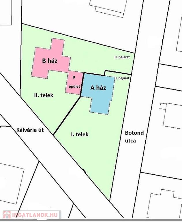 - A telken kettő családi ház van, ügyvédileg megosztva, a két családi ház között egy téglaépület helyezkedik el, ami elválasztja a két házat egymástól.