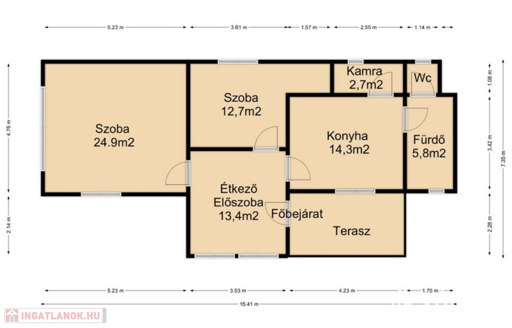 Belső lakrész helységei: 2 külön bejáratú szoba melyek közül, a kis szobához egy kis gardrób is tartozik, előtér-étkező közvetlen teraszkapcsolattal, külön fürdő, külön mellékhelyiség, konyha kamrakapcsolattal.