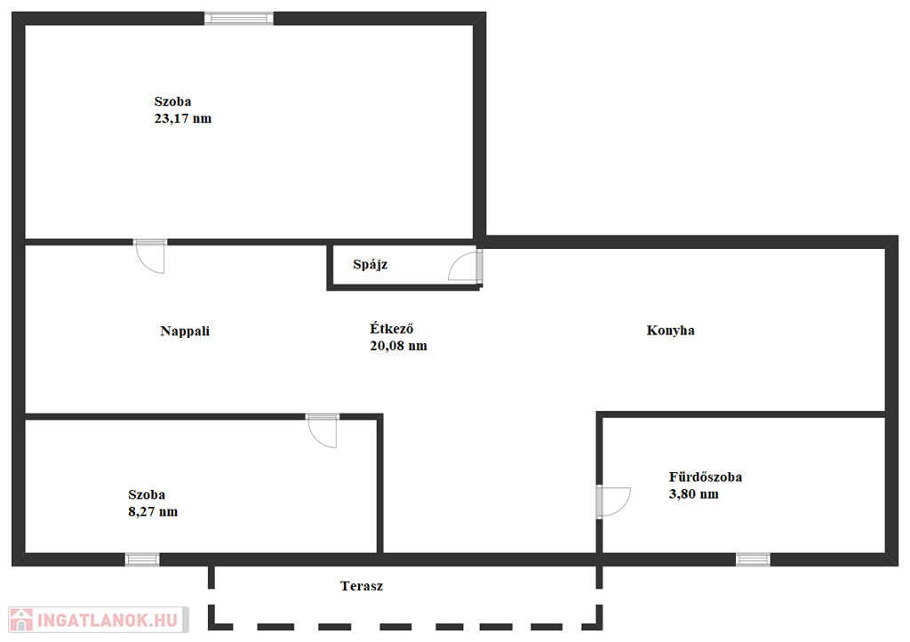 A ház praktikus elrendezésű: a konyha, étkező és nappali egy légtérben található, ami tágas és barátságos hangulatot biztosít. Az ingatlanban két különálló szoba található, amelyek kényelmes életteret nyújtanak.