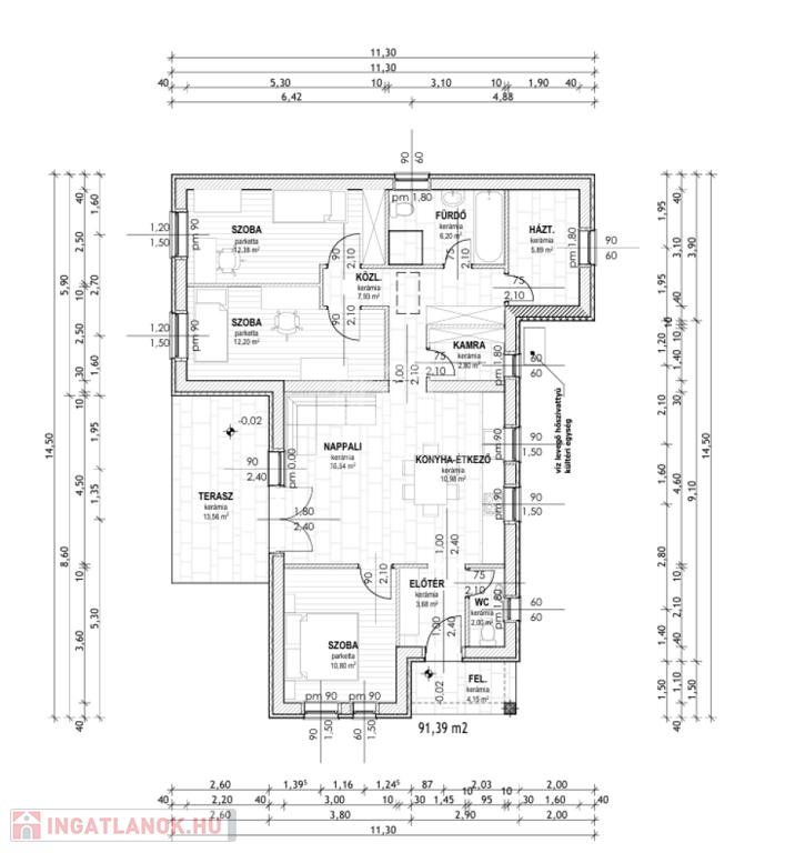 előtér 3,68 m2, wc 2,00 m2, előtér 3,68 m2, terasz 13,56 m2.