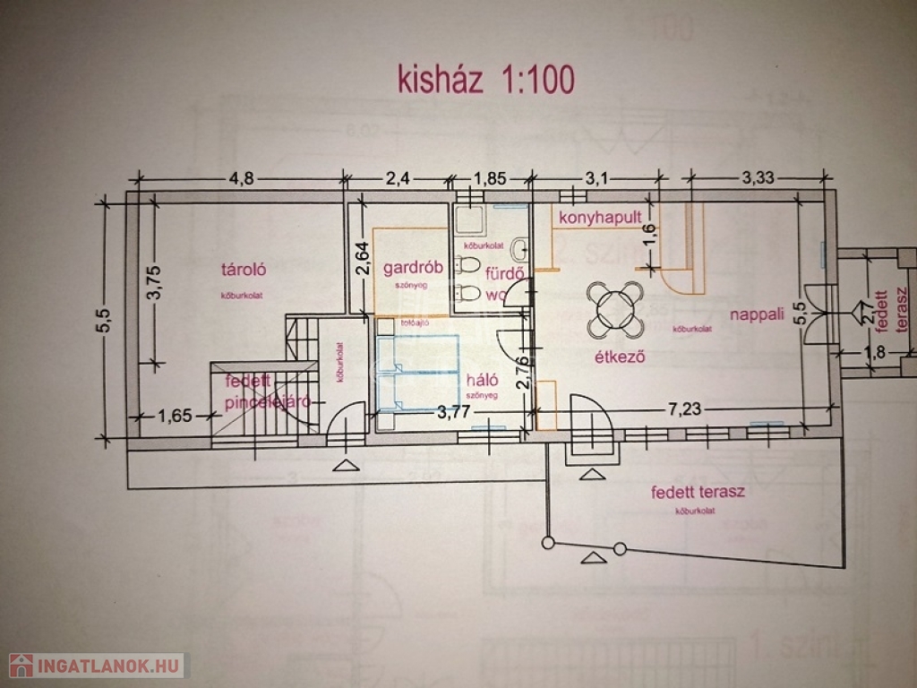 Helyiségei: Amerikai konyhás nappali, hálószoba, gardrób, fürdő, pince alatti tároló, terasz
