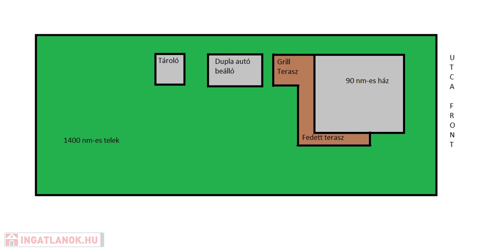 Az 1400 nm-es, szabályos alakú, külön HRSZ-on nyilvántartott telken az épület elhelyezése ideális, hiszen a ház körbe járható, a telken két autó számára fedett autóbállót alakítottak ki, valamint további zárt tárolók állnak rendelkezésre. A kertben fúrt kút és vízelnyelő kút is rendelkezésre áll, ha valaki gazdálkodna a gyümölcsfákkal tarkított jó méretű telken.