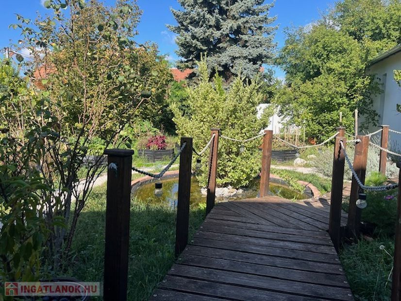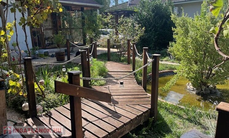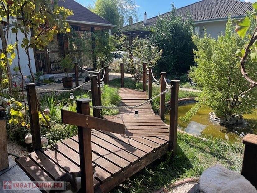 Parkosított kertben a dísz halastó fölött fahíd vezet a nyári konyha felé.