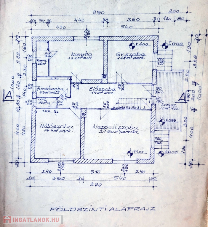 A nettó 137,4m2 lakótérből az ALSÓ SZINT: 83,1m2 (melynek az elosztása: tágas előszoba 14m2, ahol a cipők kabátok kényelmesen elhelyezhetőek, továbbá ebből a térből érhető el kényelmes falépcsőkön keresztül az emeleti szint, balra a tágas 21,60m2-es nappali és két igen jó méretű hálószoba (14,4m2, 11,8m2-rel) egy külön mellékhelyiség (1,2m2) egy káddal felszerelt fürdőszoba, és egy különálló ablakkal rendelkező 13,2m2-es konyha-étkező, melyből egy 2,6m2-es kamra is leválasztásra került)