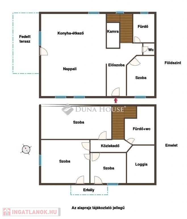 -Földszint:tágas, világos amerikai konyhás nappali étkezővel, amely közvetlenül kapcsolódik a fedett teraszhoz, praktikus tároló a lépcső alatt, fürdőszoba, külön mellékhelyiség, 1 szoba, amely alkalmas lehet dolgozónak, vendégszobának vagy akár hálónak