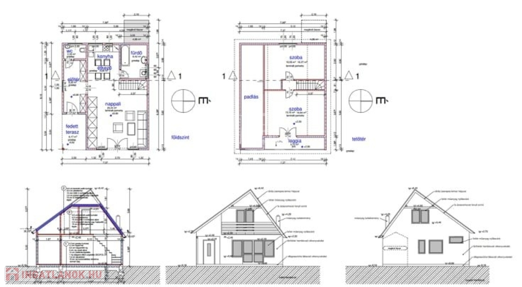 A földszinten található előszoba, nappali, konyha, fürdőszoba. A tetőtérben kapott helyet a két hálószoba.