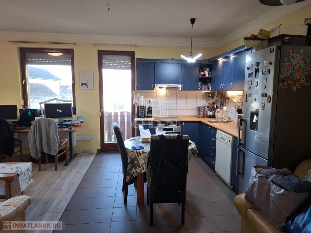 Földszint: fedett teraszon keresztül jutunk a 70 m2-es lakás előterébe, ahonnan elérhető a felső szint, akár külön bejárattal is így a lakás több generáció együttélésére is ideális. A földszint tágas elrendezése: amerikai konyhás nappali, kamra, két szoba, fürdőszoba és külön WC elosztású.