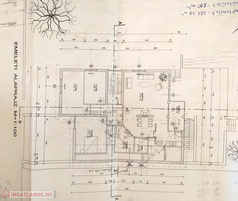 Az EMELET 120nm, helyiségei: amerikai konyhás nappali 18nm, + kandallós nappali 29nm, + 3 szoba 11nm; 13nm;14nm. A szobából és a konyhából közvetlen kijárat van az erkélyre.