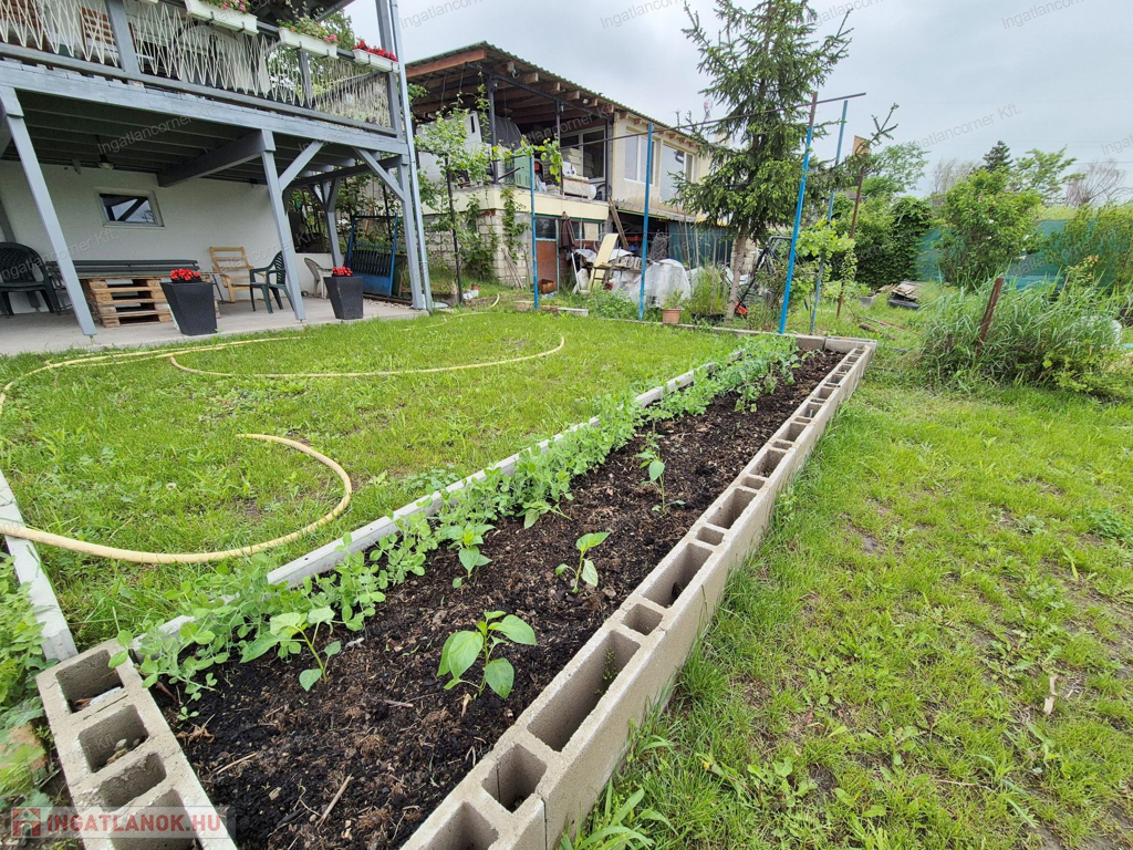 -KERT: a kert nagy része füvesített, a kert két oldalon kiépített magas ágyáskerült (ágyásokig vezető járda térburkolattal ellátott, még egy kis szakasz befejésre vár, amit a tulajdonos intéz) megépítésre a fűszer és idény palánták elhelyezésére illetve számtalan gyümölcsfa és gyümölcs bokor kerül beültetésre az elmúlt években. Az öntözése a Dunából megoldott. Jobb oldalon a magas ágyások előtt egy medence került elhelyezésre.