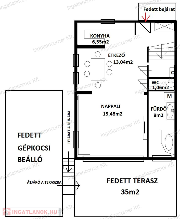 -A nappalin lévő hatalmas tolóajtaján jutunk ki a 35m2-es FEDETT teraszára, ahol a DUNAI látkép foga minket!