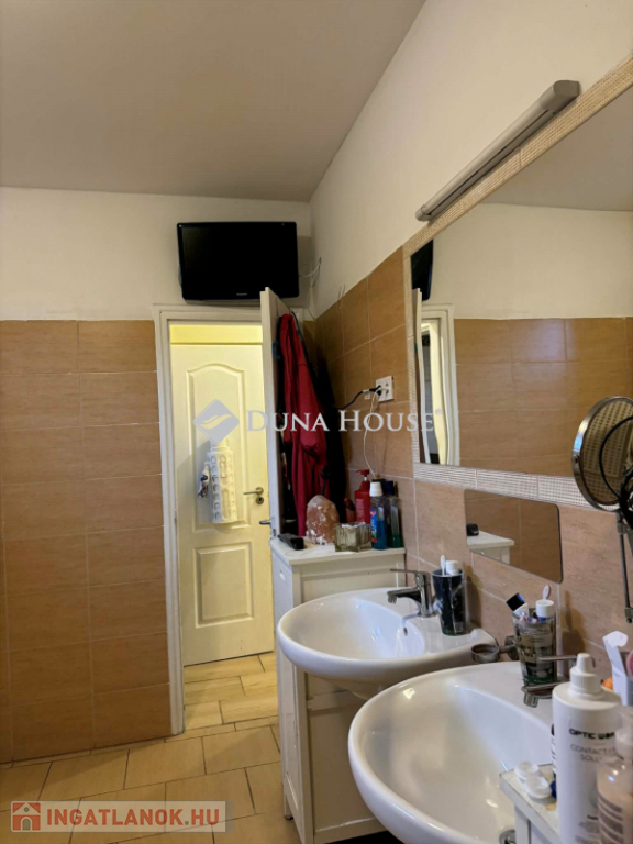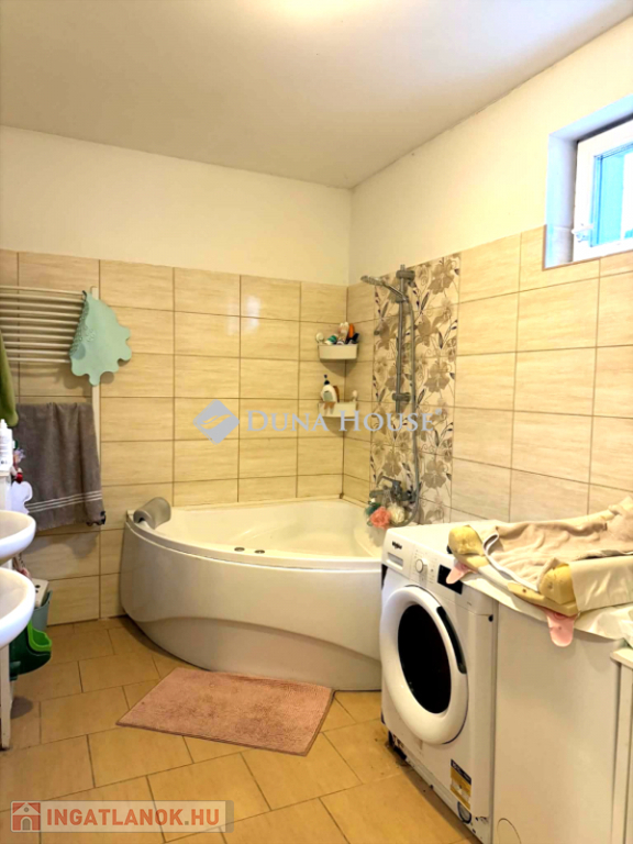 A fürdőszobában jelenleg sarokkád van, két mosdó, mosó és szárítógép a tágas térben bőven elfér, esetlegen még szauna is elfér ebben a helyiségben.