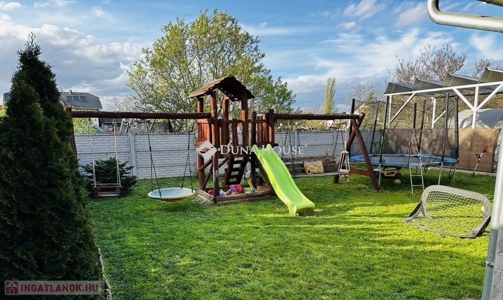 Ahogy a képen is látható a hátsó kert jelenleg a kisgyermekek szórakozását biztosítja egy egyedi tervezésű játszótérrel, mely szintén a ház eladási árát képezi, ugyanúgy, mint a konyhában található beépített szekrény és pult is.