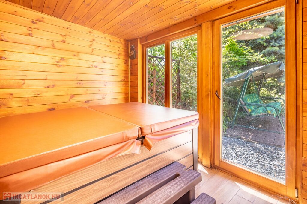 A zárt jakuzzi a kertben külön épületben helyezkedik el, előtte fedett terasz található.