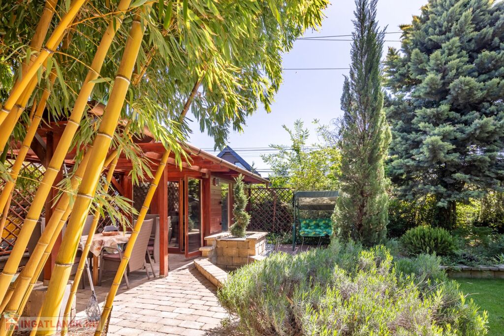 A fedett terasz és a jakuzzi mellet a kertben egy automata vízforgatóval telepített kis tó került kialakításra.