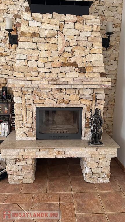 - Működő kandalló mely pattintott mészkőmárvánnyal van kirakva
