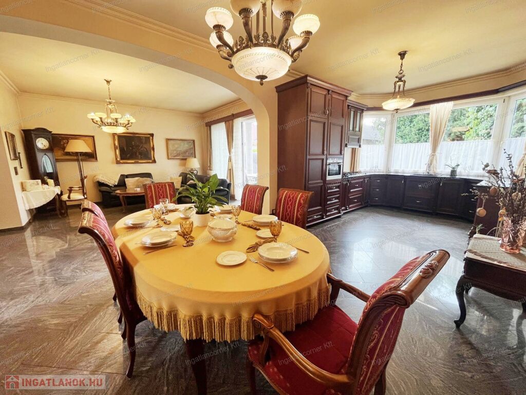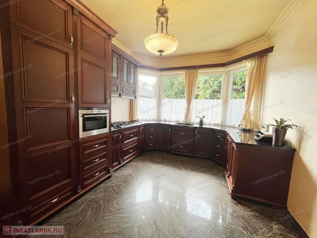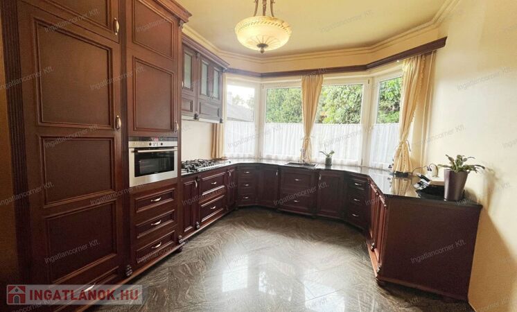 A konyha külön említést érdemel: egyedileg gyártott, diófa borítású, gránit munkalappal készült konyhabútor került beépítésre, mely Bosch 12 terítékes mosogatógéppel, beépített Siemens olajsütő-fritőzzel, Siemens sütővel és mikrohullámú sütővel, beépített hűtővel és 5 gázrózsás tűzhellyel van felszerelve. Ezek a beépített gépek és bútorok a vételár részét képezik!