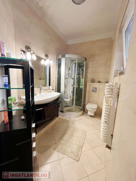 A ház teljes egészében padlófűtéssel rendelkezik, amit egy Saunier Duval típusú gázkazán működtet – ez nemcsak kényelmes, de energiatakarékos megoldás is. A nyári hűtésről egy 3,5 kW-os Panasonic klíma gondoskodik. A nyílászárók korszerű, két rétegű műanyag szerkezetűek, melyek kiváló hő- és hangszigetelést biztosítanak. A nappaliból közvetlen kijárat vezet a kertre nyíló, modern emelő-toló ajtón keresztül, ami nemcsak elegáns, de praktikus megoldás is.