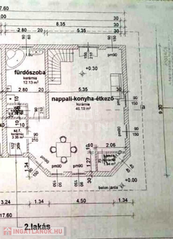 Földszint: nappali -konyha-étkező 48,2m2, előtér 3,35m2, fürdő 12,13m2, toalett 1,2m2, kamra 1m2, fedett terasz 25m2;