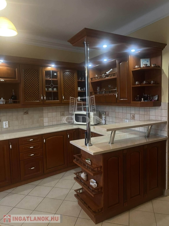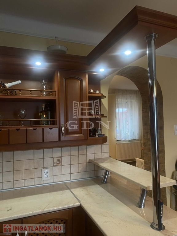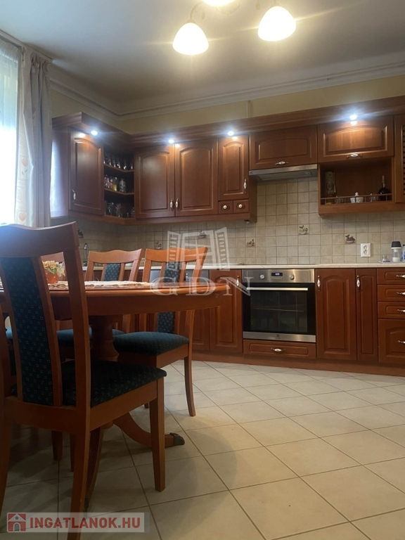 A ház egyik különleges értéke a gyönyörű, egyedi, tömörfából készült konyhabútor, amely elegáns, időtálló megjelenést biztosít.