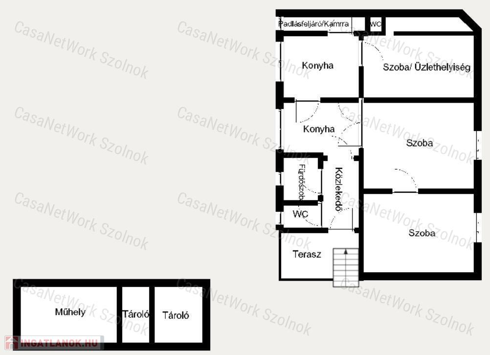 - az egyik szoba üzlethelyiséggé lett alakítva, külön mosdóval és külön villanyórával rendelkezik, víz és gázórákból almérők vannak felszerelve,