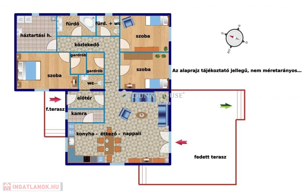 A közlekedőből lehet a hálószobákhoz és a fürdőkhöz jutni, valamint a háztartási és gépészeti helyiség, továbbá a gardrób is innen nyílik.