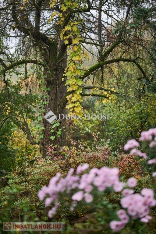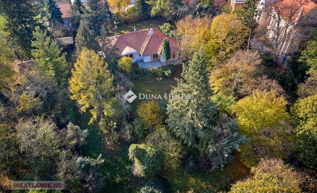 Az ingatlan egyediségét másfelől a kivételes adottságú, lankás, részben panorámás telek adja. Elhelyezkedése is kiváló, de páratlanságát az arborétum jellegű környezet adja. A telek méretei is kivételesek a környéken, kb. 40x 60 m, akár meg is osztható, további beépítésre is van lehetőség. Autóval két utcából is megközelíthető. A különálló garázshoz a kert belváros felőli oldalán lehet behajtani.