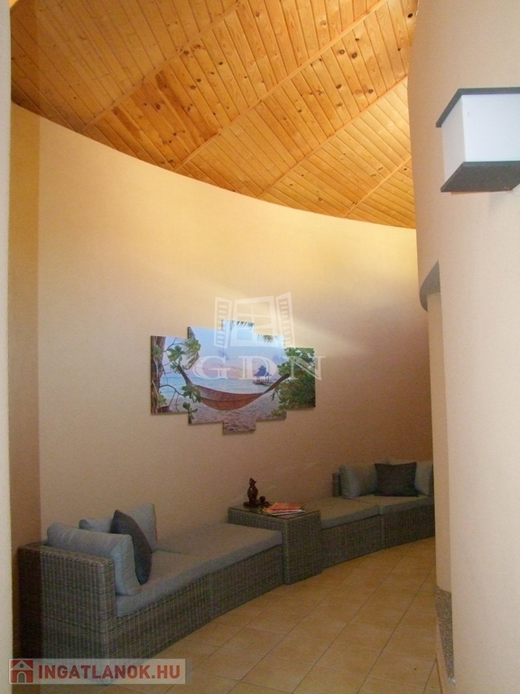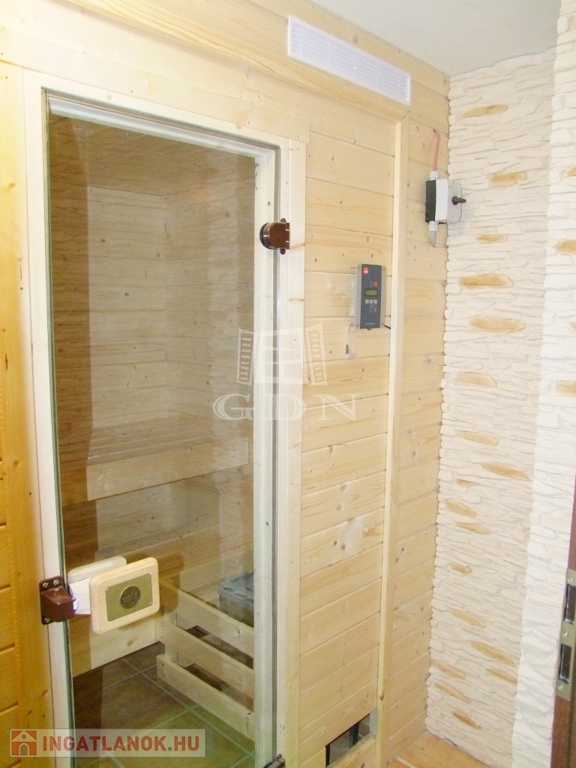 A pincében mini wellness részleget találunk. Szolárium és szauna segíti a mindennapi stressz feloldását. Ezen a szinten még háztartási helyiség, ikergarázs és egy 40 m-es vállalkozás céljára kialakított helyiség is van.