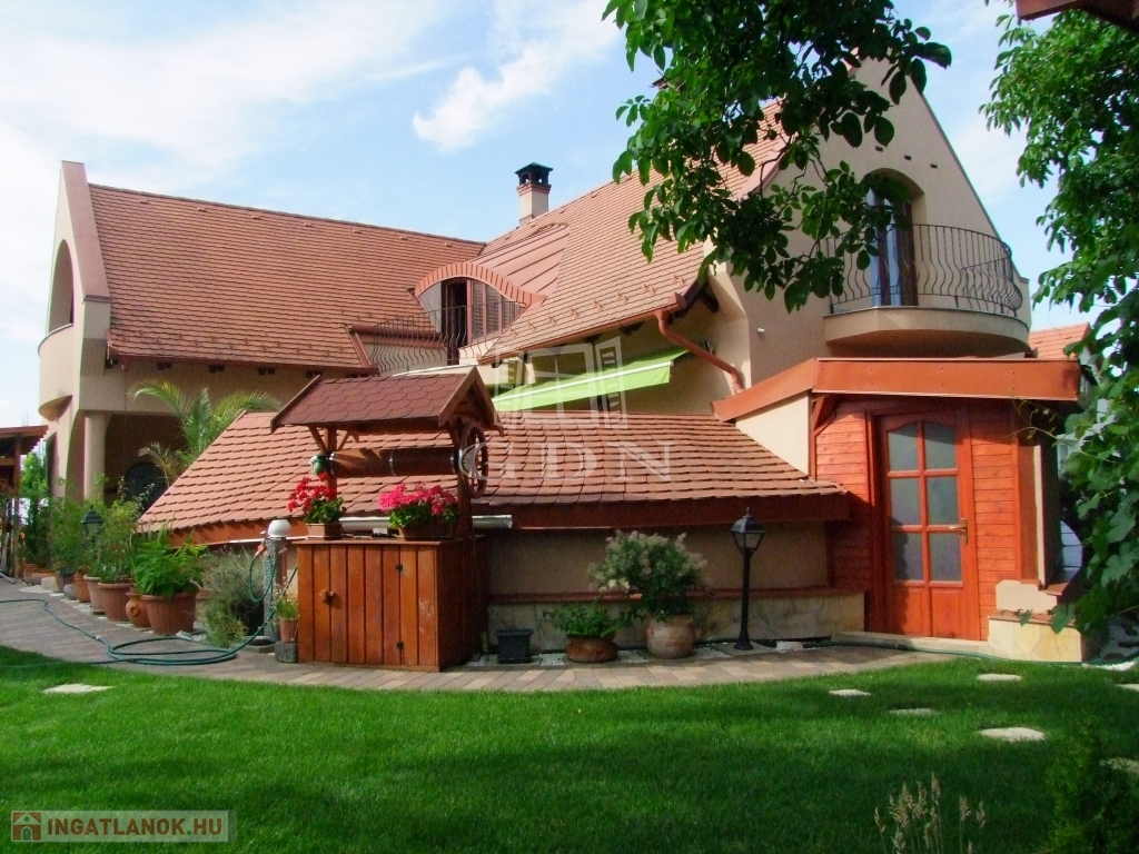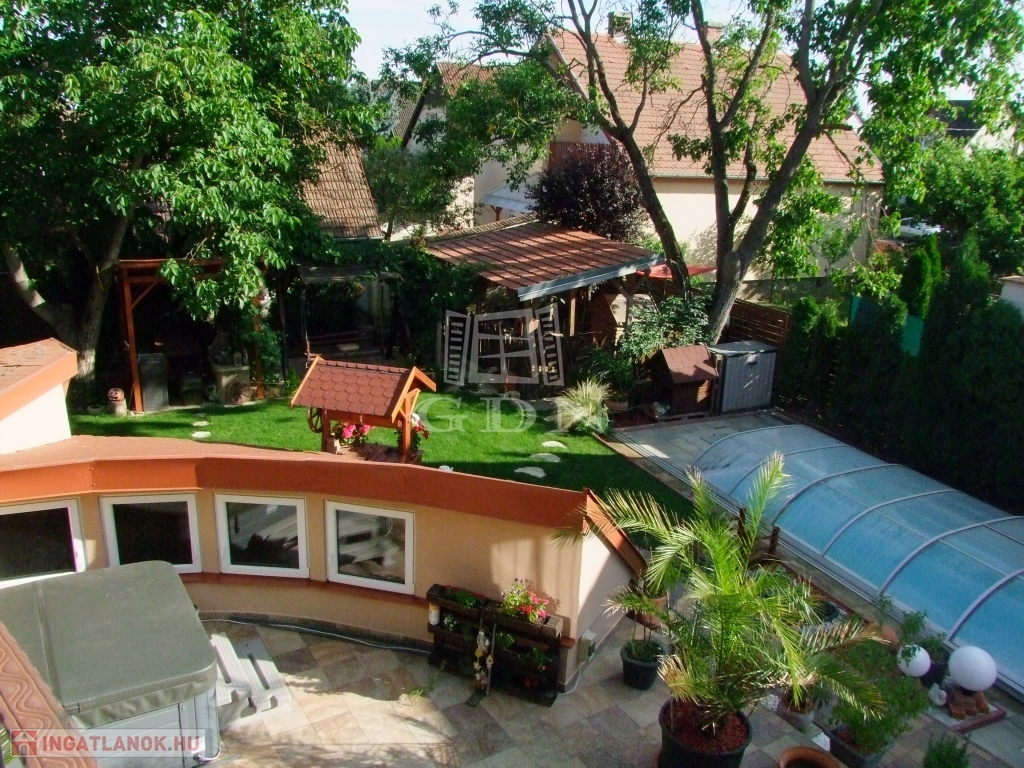 A gondozott parkosított udvaron fedett gépkocsibeálló, 18 m2-es 1.5 m mély fedett medence, kerti hinta, grillező és kerti faház található.