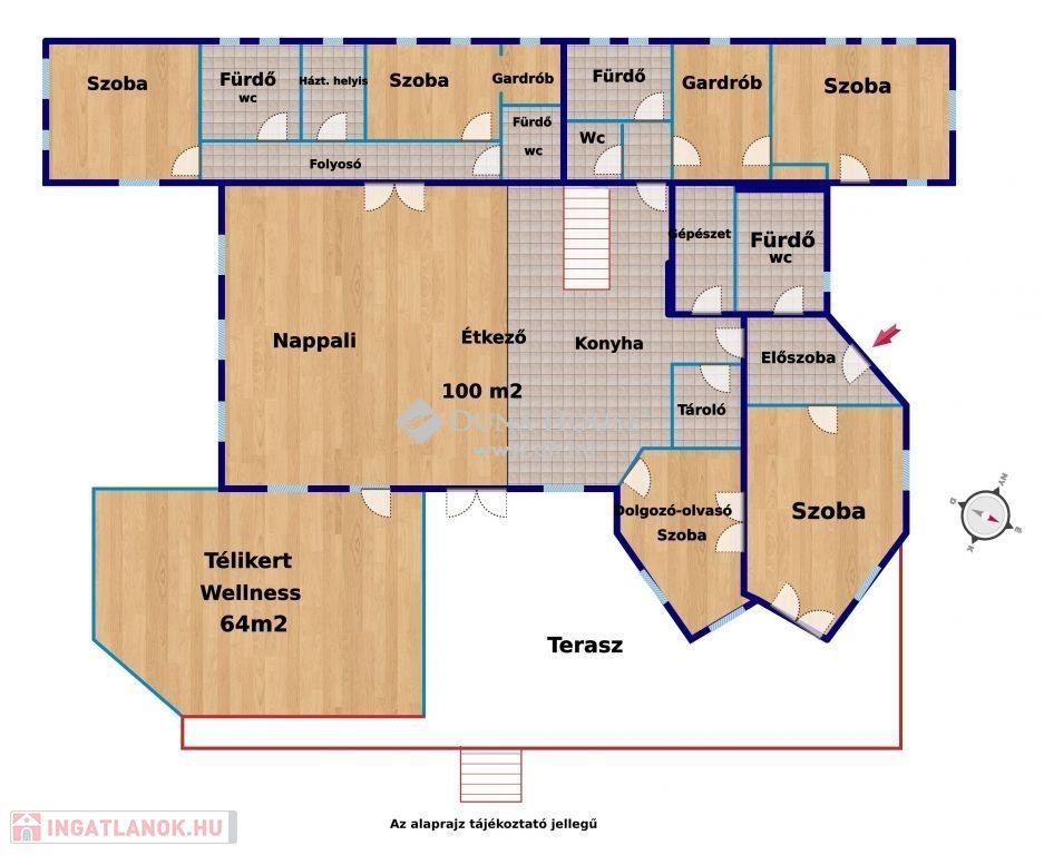 A földszint alapterülete 298 m2+ 64 m2 a télikert
