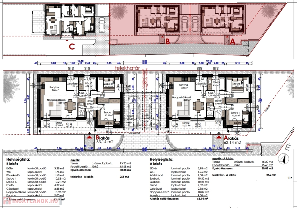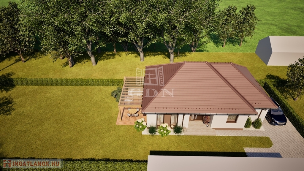 A Wienerberger Porotherm téglából épülő házak magas műszaki tartalommal épülnek. Tetőszerkezete C22 I. osztályú , rovar, gomba és lángmentesítővel kezelt faanyaggal kerül kivitelezésre. Fedése Terran vagy Bramac cseréppel történik, az összes rendszer tartozékkal, előírások szerint helyenként hófogóval. Bádogos szerkezetek, a külső vízelvezetések ereszcsatornái, a lefolyócsövei és az egyéb bádogos szerkezetek 0.6 mm vastag acéllemezből készülnek. Homlokzati falfelületek 15 cm vastag EPS hőszigetelő rendszert, a lábazatok 10 cm vastag XPS lábazati hőszigetelő rendszert kapnak. A padozatokba 10 cm vastag teherbíró EPS hab hőszigetelés kerül. A födém hőszigetelése 25 cm vastag ásványgyapot szigetelőanyaggal történik. Külső nyílászárói műanyag, három rétegű üvegezéssel szerelt, fokozottan hang-és hőszigeteltek. Fűtése, a háztartási helyiségben elhelyezett 10Kw teljesítményű Gree Versati 3 hőszivattyúval történik, padlófűtéses hőleadással szabályozható termosztáttal. A hőszivattyú biztosítja a melegvizet is, egy 200 literes hőtárolós víztartállyal. Nappaliában 3.5 Kw teljesítményű hűtő-fűtő klíma kerül.Az ingatlanban riasztó, kaputelefon, előkészítés történik. Beltéri ajtók, hideg-meleg burkolatok, szaniterek, csaptelepek választhatók.. Ha bővebb tájékoztatást szeretne, kérem keressen. Vegye igénybe irodánk szolgáltatásait. Hitelügyintézésben is segítünk.