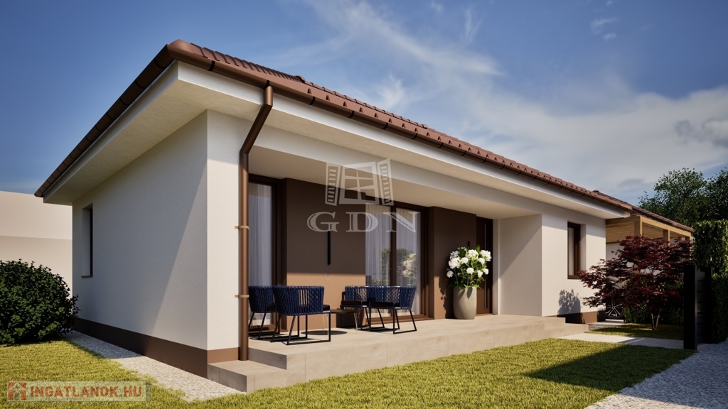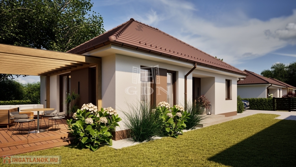 A Wienerberger Porotherm téglából épülő házak magas műszaki tartalommal épülnek. Tetőszerkezete C22 I. osztályú , rovar, gomba és lángmentesítővel kezelt faanyaggal kerül kivitelezésre. Fedése Terran vagy Bramac cseréppel történik, az összes rendszer tartozékkal, előírások szerint helyenként hófogóval. Bádogos szerkezetek, a külső vízelvezetések ereszcsatornái, a lefolyócsövei és az egyéb bádogos szerkezetek 0.6 mm vastag acéllemezből készülnek. Homlokzati falfelületek 15 cm vastag EPS hőszigetelő rendszert, a lábazatok 10 cm vastag XPS lábazati hőszigetelő rendszert kapnak. A padozatokba 10 cm vastag teherbíró EPS hab hőszigetelés kerül. A födém hőszigetelése 25 cm vastag ásványgyapot szigetelőanyaggal történik. Külső nyílászárói műanyag, három rétegű üvegezéssel szerelt, fokozottan hang-és hőszigeteltek. Fűtése, a háztartási helyiségben elhelyezett 10Kw teljesítményű Gree Versati 3 hőszivattyúval történik, padlófűtéses hőleadással szabályozható termosztáttal. A hőszivattyú biztosítja a melegvizet is, egy 200 literes hőtárolós víztartállyal. Nappaliában 3.5 Kw teljesítményű hűtő- fűtő klíma kerül. Az ingatlanban riasztó, kaputelefon előkészítés történik. Beltéri ajtók, hideg-meleg burkolatok, szaniterek, csaptelepek választhatók.. Ha bővebb tájékoztatást szeretne, kérem keressen. Vegye igénybe irodánk szolgáltatásait. Hitelügyintézésben is segítünk.