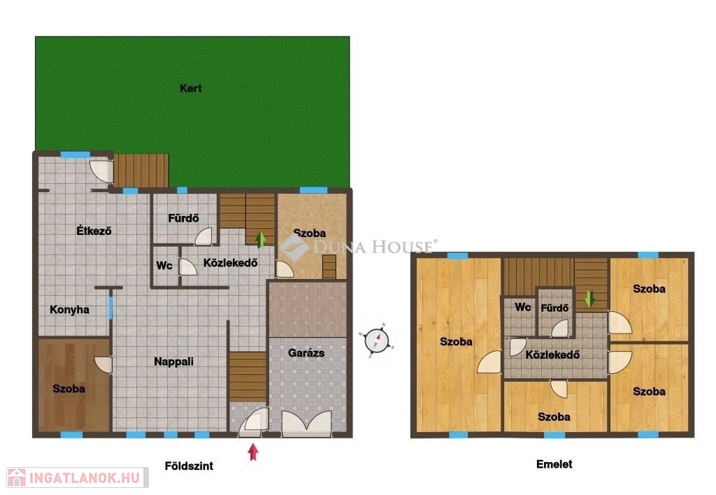 Az emeleten a nappalin kívül 2 egész, egy félszoba, egy fürdő és egy wc lett kialakítva, így akár generációk összeköltözésére is ideáli az épület.