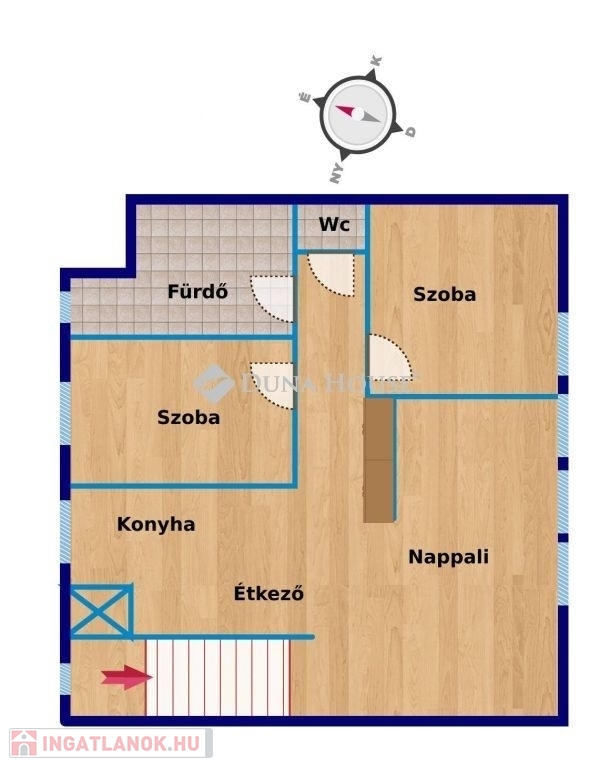 Jelenlegi kialakítás szerint az emeleten konyha-étkező-nappali+ 2 hálszoba, fürdő, wc kapott helyet. (Klímával felszerelve)