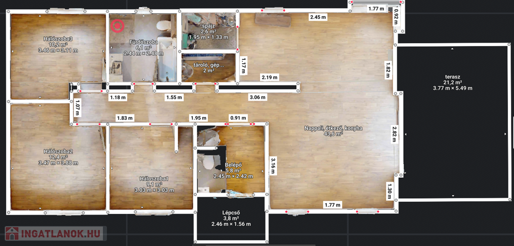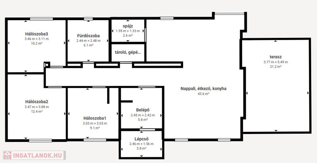 -3 hálószoba + nappali-konyha-étkező, gardrób + spájz, fürdő (kád + zuhany) + külön WC