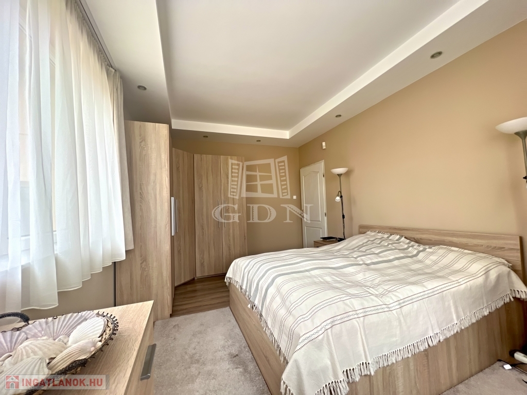 A kert rendezett, barátságos hangulatú, fedett kiülővel és kerti sütőhellyel. Ez az a tér, ahol a nyári esték természetesen telnek, különösebb szervezés nélkül. A házhoz terasz, garázs és több autó számára kialakított udvari parkoló is tartozik.