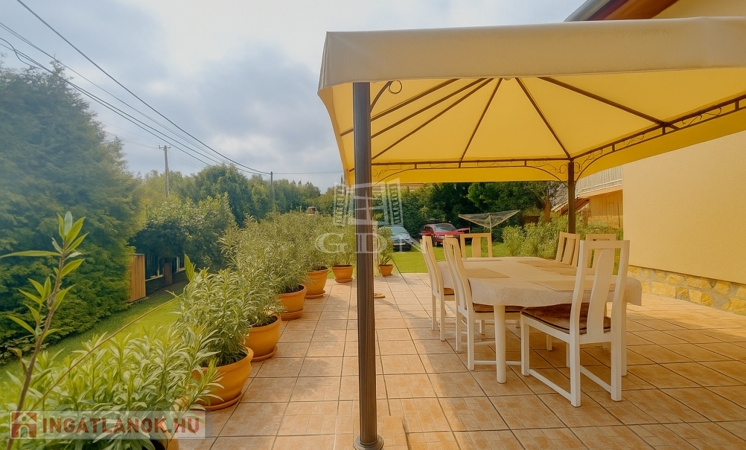 A kert rendezett, barátságos hangulatú, fedett kiülővel és kerti sütőhellyel. Ez az a tér, ahol a nyári esték természetesen telnek, különösebb szervezés nélkül. A házhoz terasz, garázs és több autó számára kialakított udvari parkoló is tartozik.