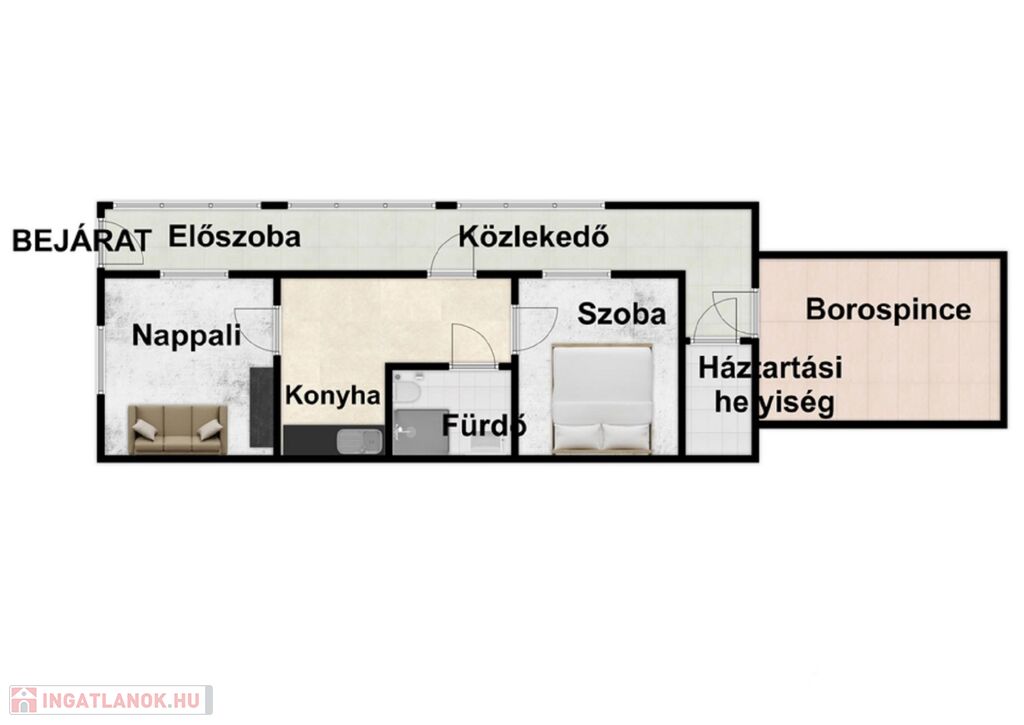 -összesen 85nm-es( konyha, fürdőszoba, 1 nappali, 1 lakószoba, előszoba, közlekedő, háztartási helyiség és egy borospince)