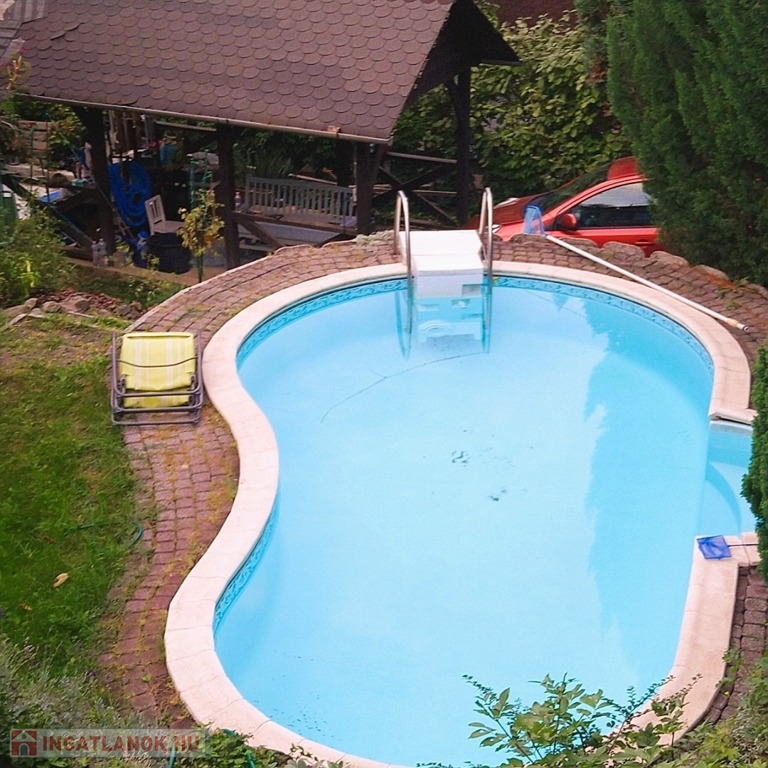 Az udvaron hangulatos, megvilágítható „fóliázott” (nem csempés) medence, fedett autóbeálló, tűzrakóhely, sziklakert, ősfák és dísznövények találhatók.