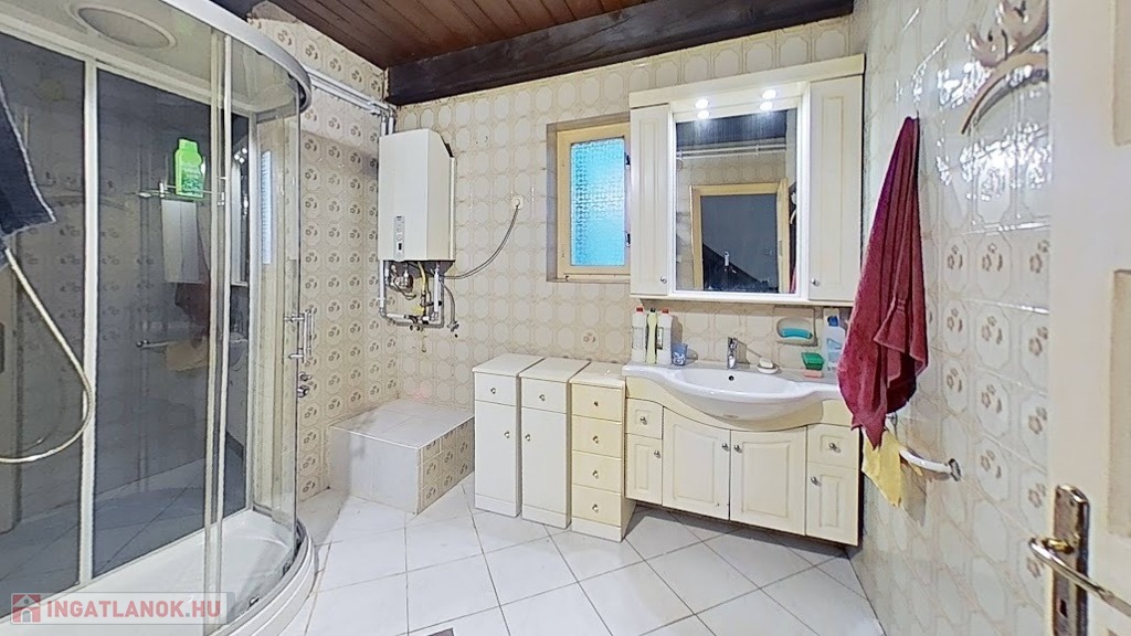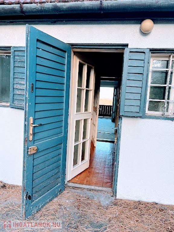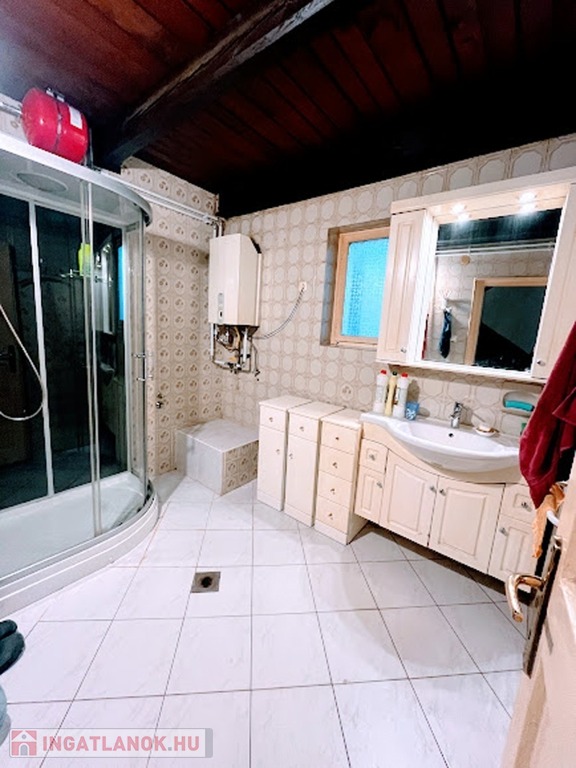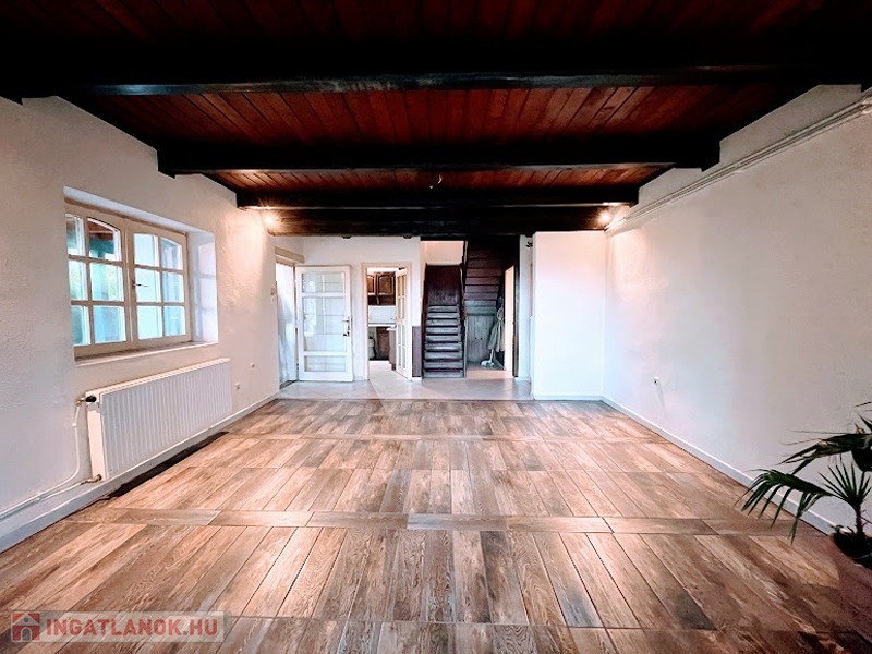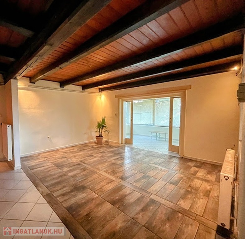 Az alsó szinten, nagy fedett terasz, nappali (vörösfenyő gerendákkal), konyha, külön wc, zuhanyzós fürdőszoba, étkező. (hidegburkolatok)