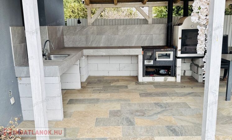 - nagy terasz fedett sütögető résszel és kemencével