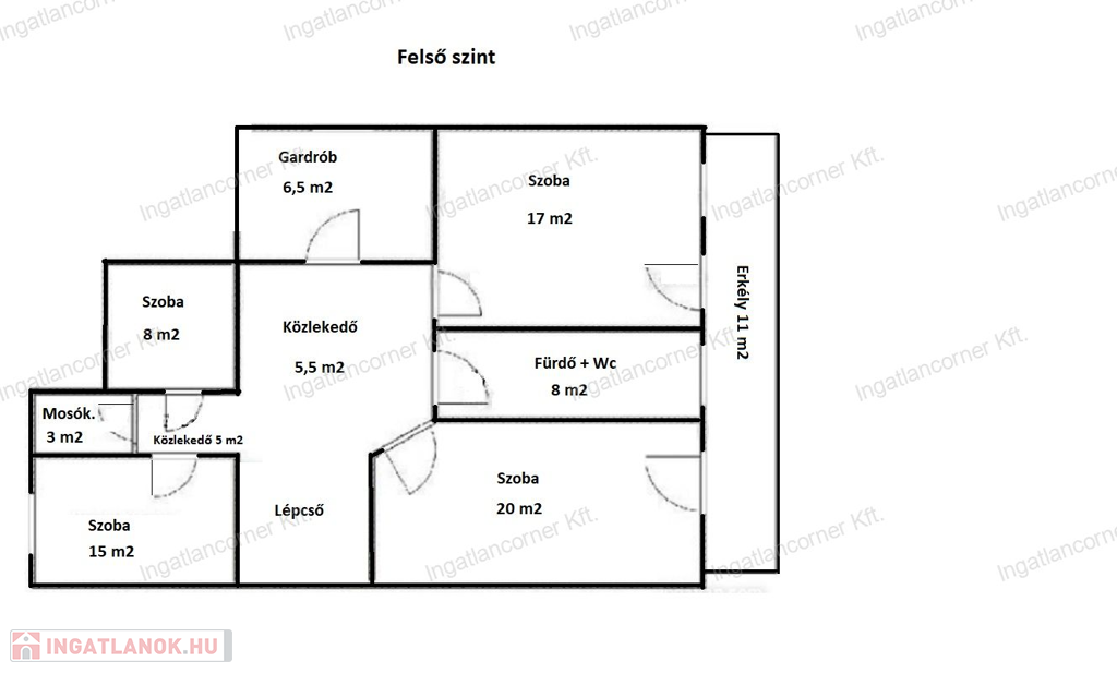 4 hálószoba (20m², 17m², 15m², 8m²),