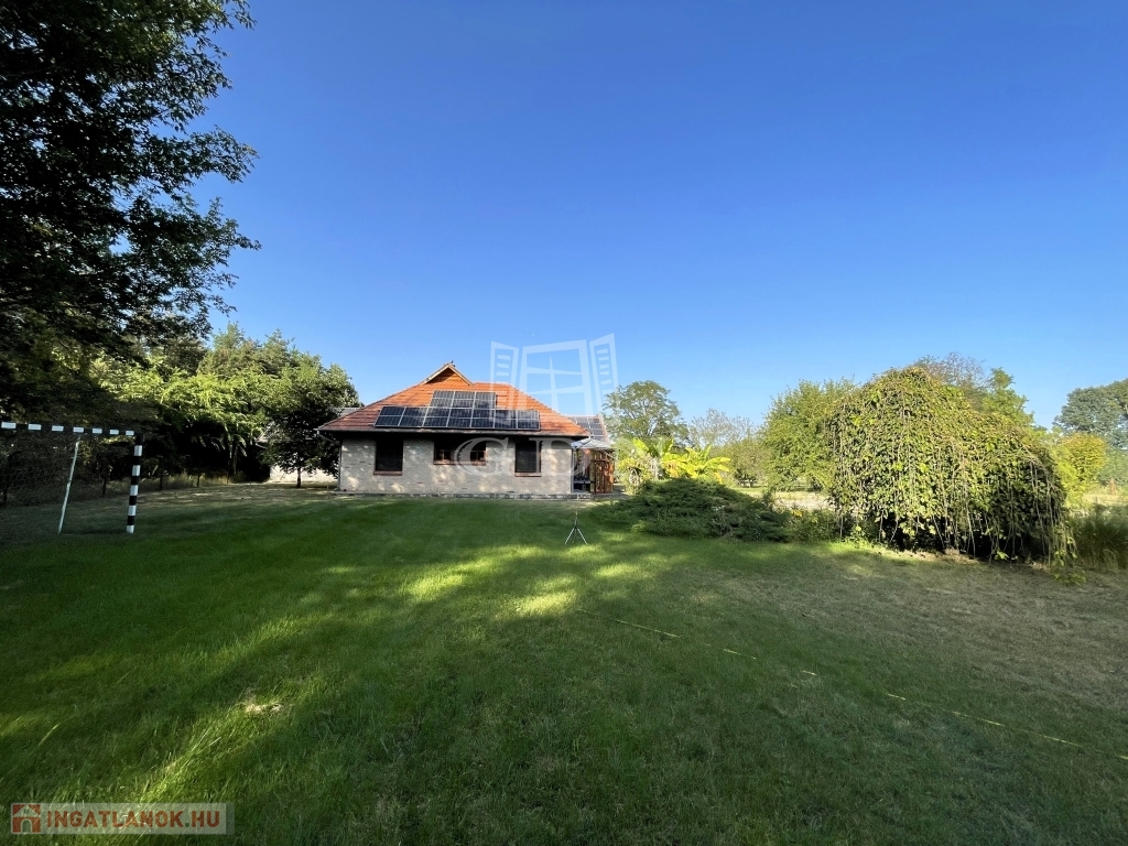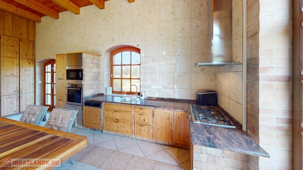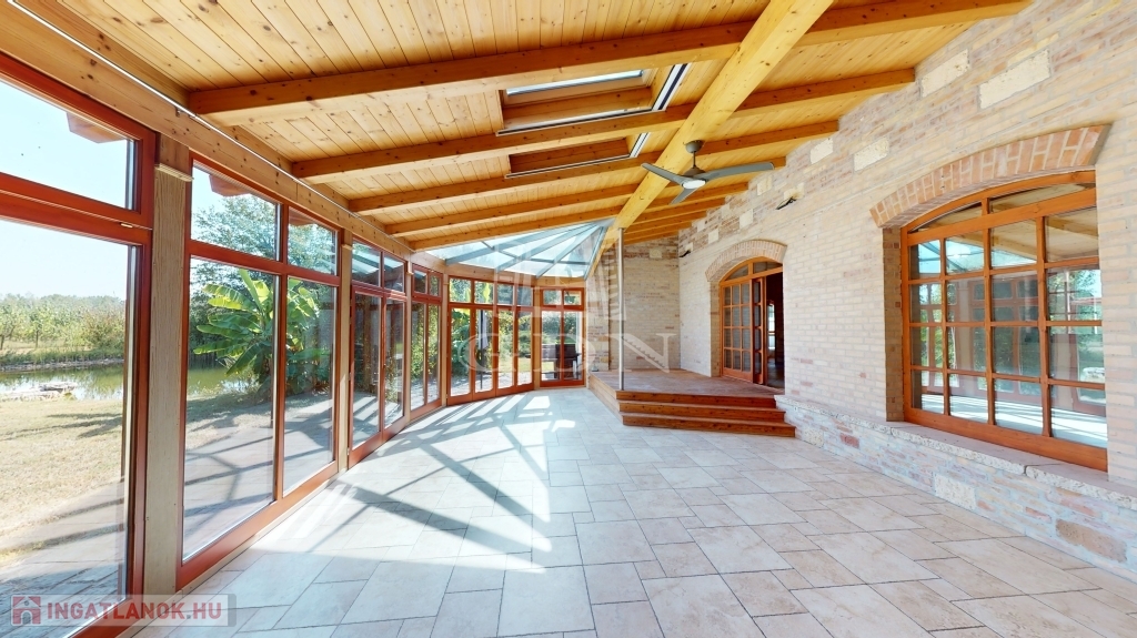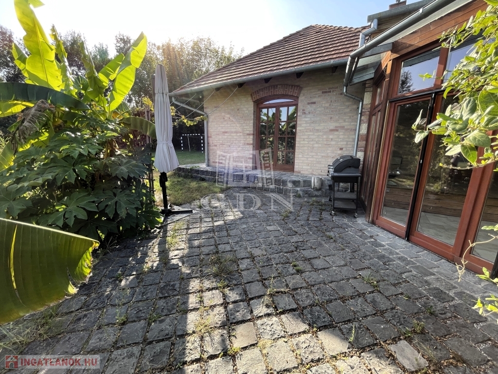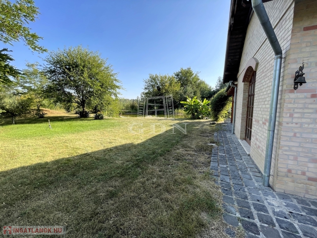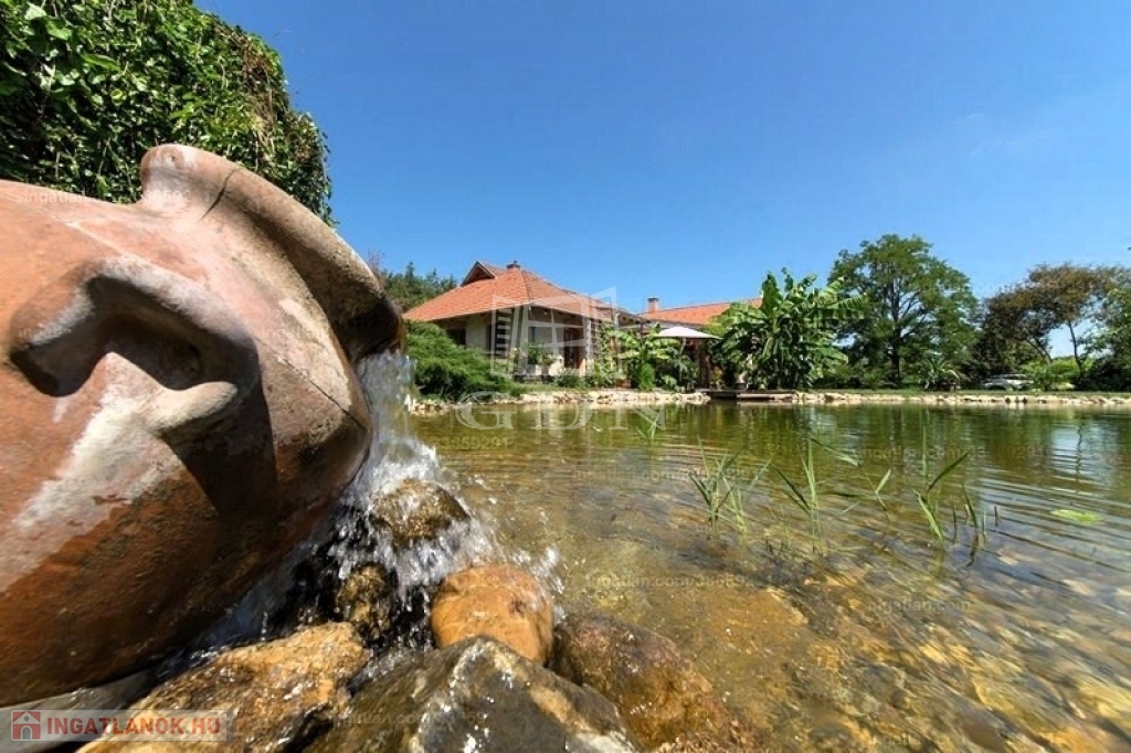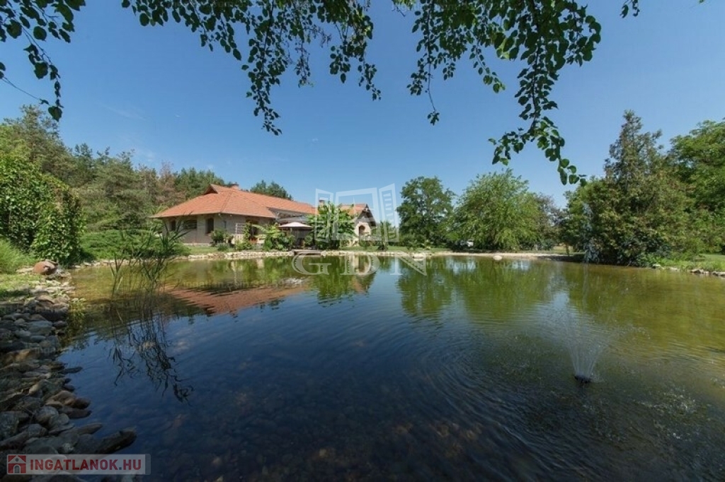 A hozzá tartozó telek 3780 nm-es kerti OÁZIS, tele egzotikus növényekkel és ízléses virágoskerttel. KÜLÖNLEGESSÉGE még a 400 nm-es, mesterségesen létrehozott tó, mely fürdésre, úszásra alkalmas, és a friss vizét fúrt kútból nyeri. Itt a labdajátéknak, úszásnak, vagy kerti partinak, nincs akadálya.